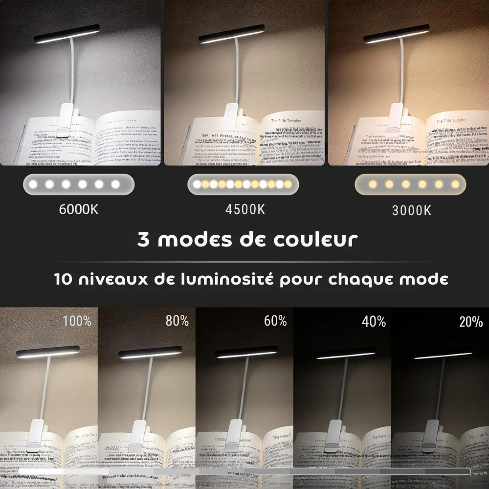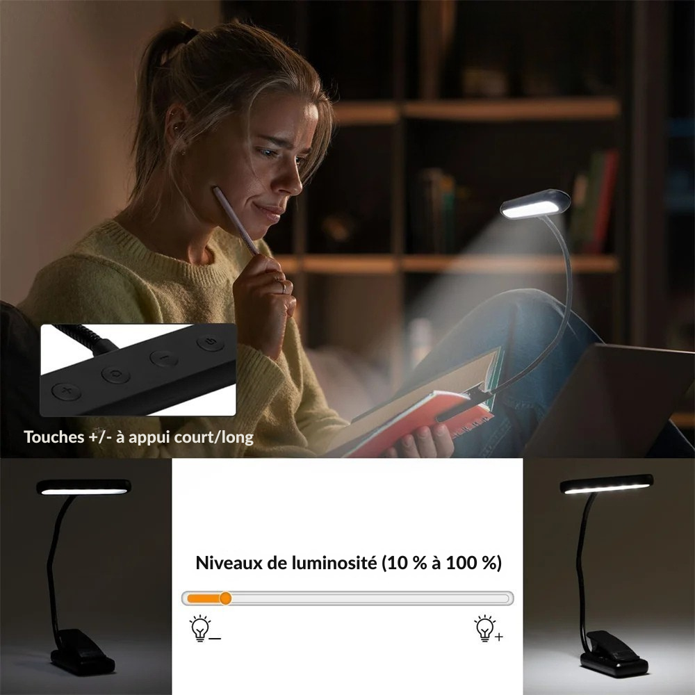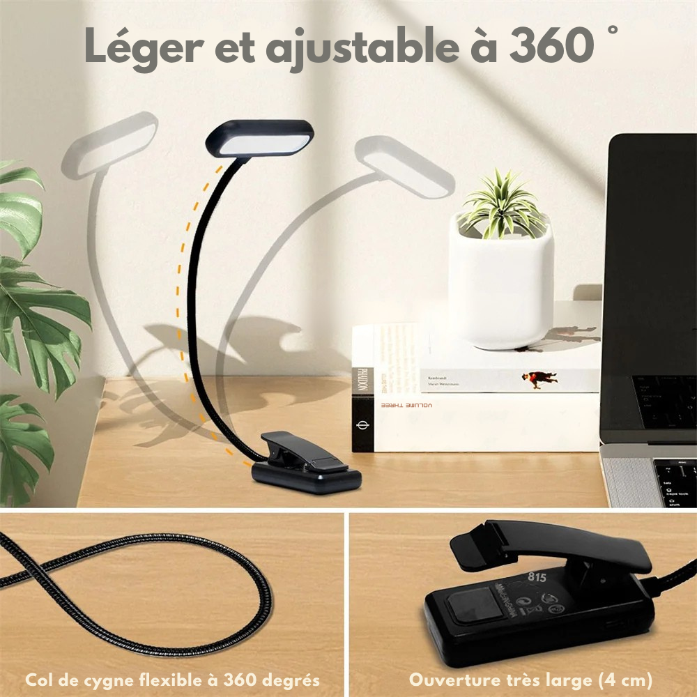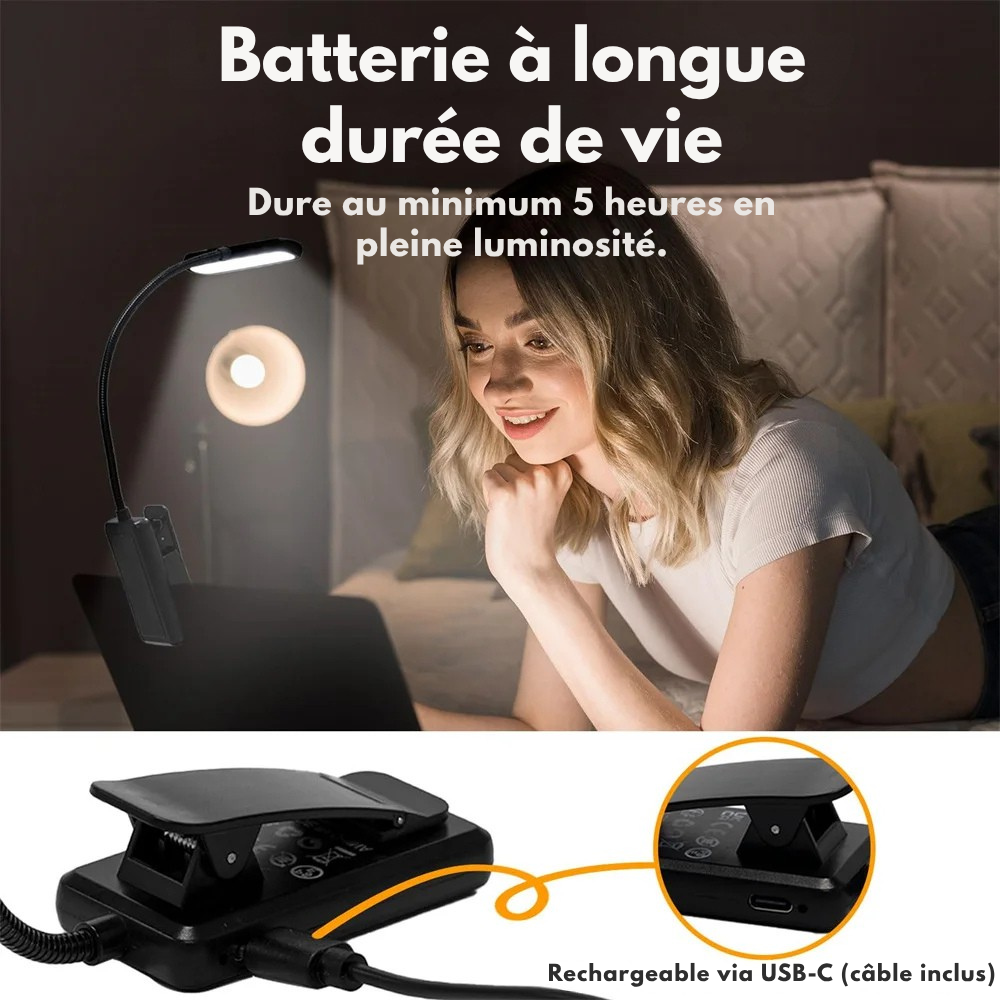 Pratique et élégante, notre lampe de lecture LED à clip rechargeable par USB vous offre un éclairage puissant et modulable, partout où vous en avez besoin – idéale pour lire sans fatiguer vos yeux, même dans l’obscurité totale.