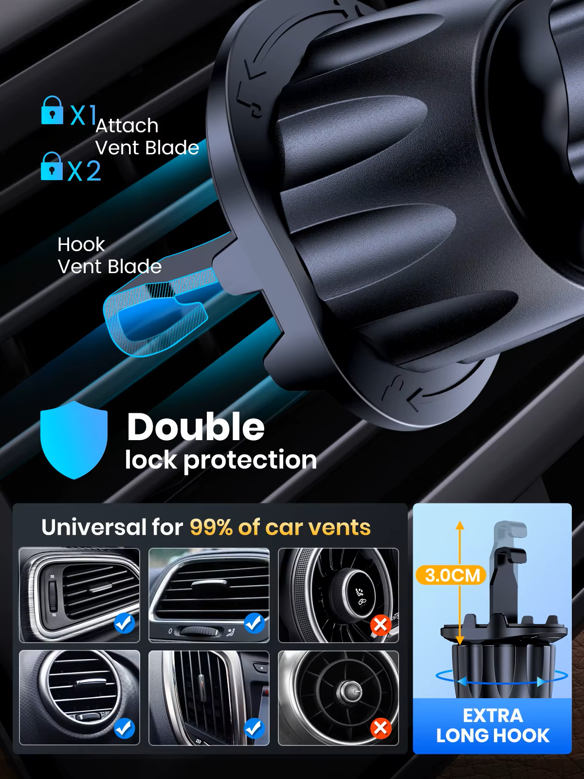 Conçu pour s’adapter à la majorité des grilles d’aération horizontales et verticales. Compact et discret, il préserve la visibilité du pare-brise pour une conduite plus sûre.